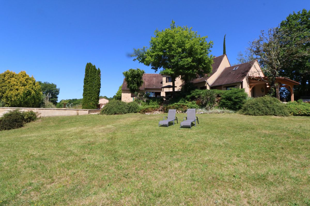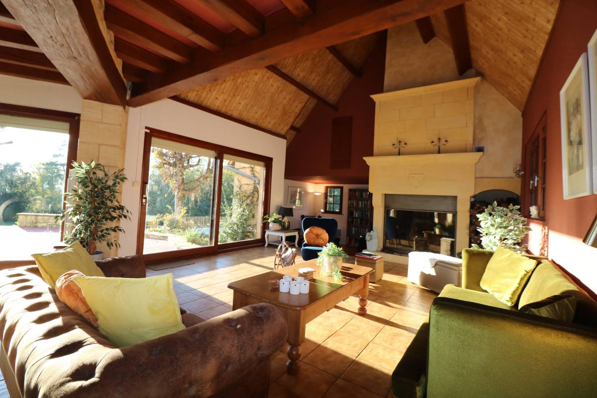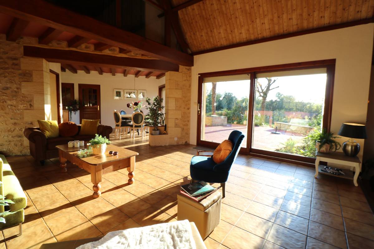 De huiskamer staat met 2 schuifpuien van elk 5 meter breed in directe verbinding met het terras aan de achterzijde van het huis, het zwembad en de tuin.